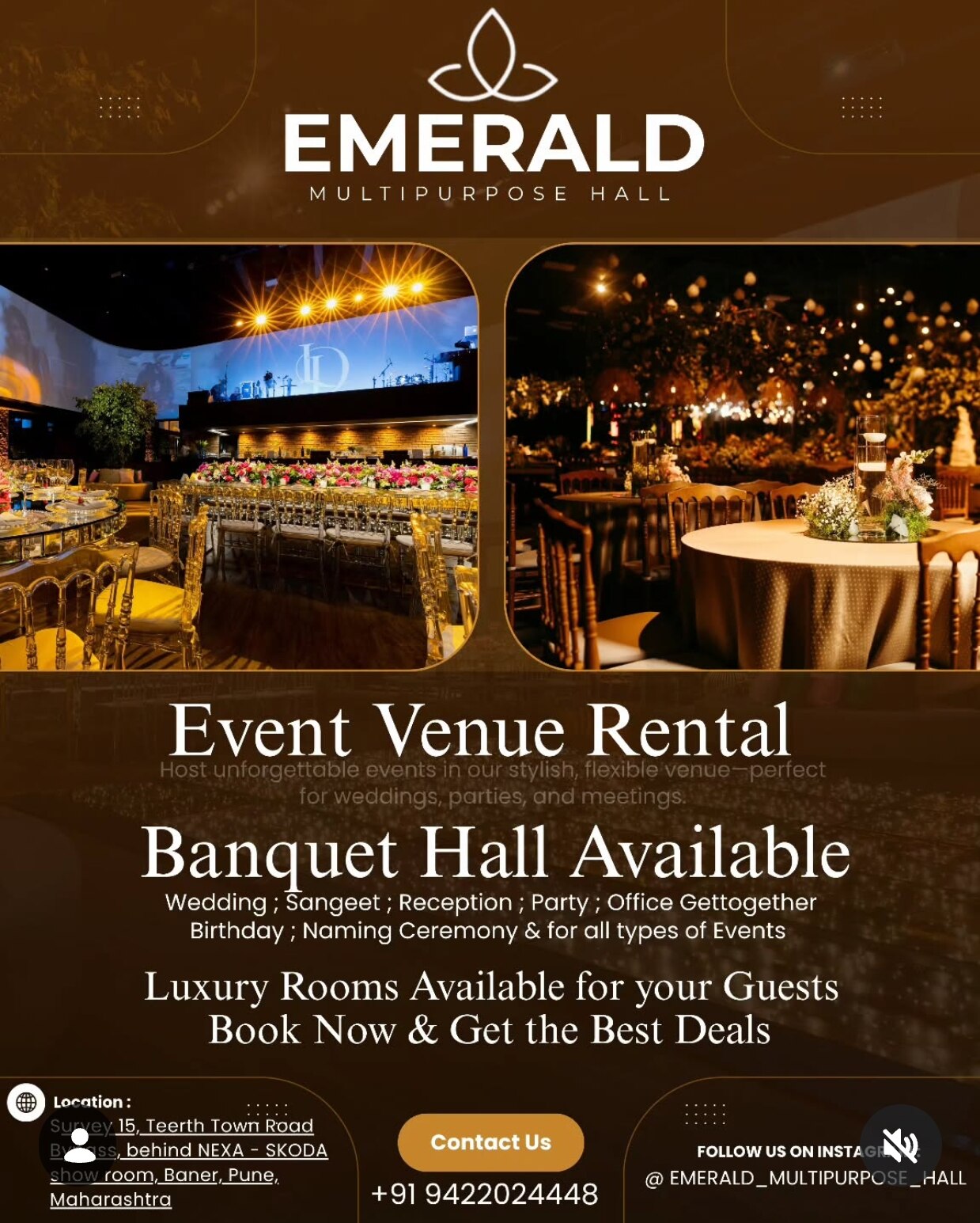 Emerald Party & Marriage Hall - Wedding Venues, Baner, Pune Located in Baner, Pune, Emerald Party & Marriage Hall is a banquet hall, and small function/ party hall. This magnificent venue offers both indoor and outdoor spacing facilities for their guests that can accommodate large gatherings. If you always wished for a grand wedding then Emerald Party & Marriage Hall is an ideal location for you. Rooms are also available for the outstation guests ... View More